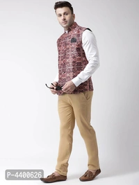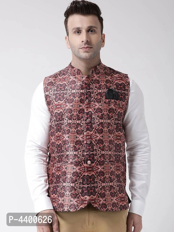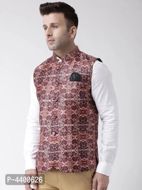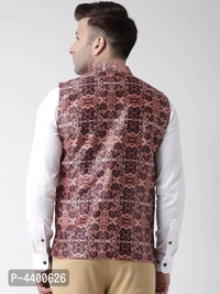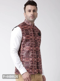 Elite Brown Polyester Viscose Printed Ethnic Waistcoat For Men