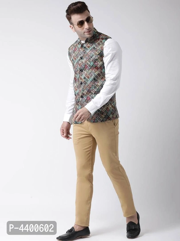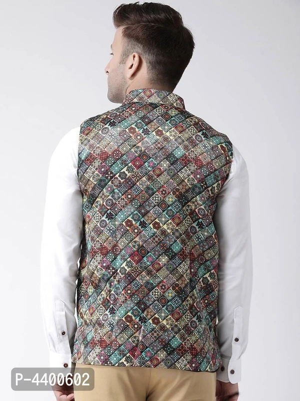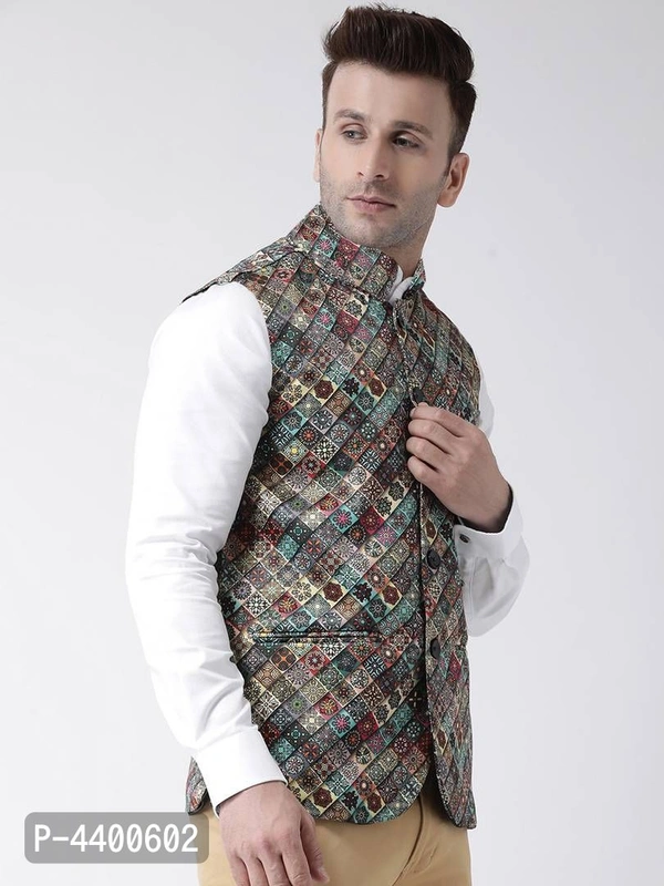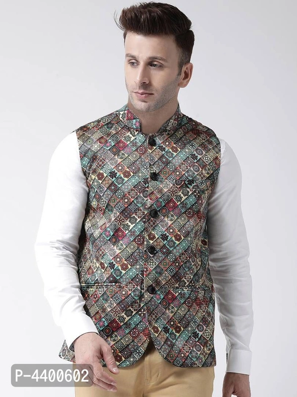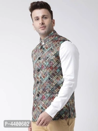Elite Multicoloured Polyester Viscose Printed Ethnic Waistcoat For Men