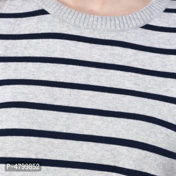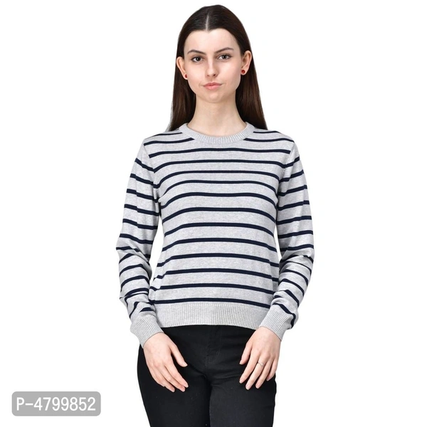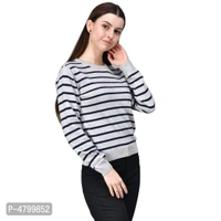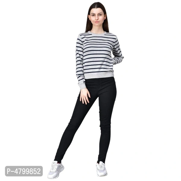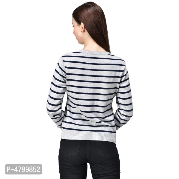 Elite White Cotton Full Sleeve Striped Round Neck Casual Pullover Sweater For Women