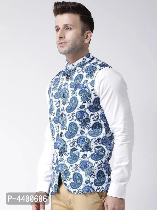 Elite White Polyester Viscose Printed Ethnic Waistcoat For Men