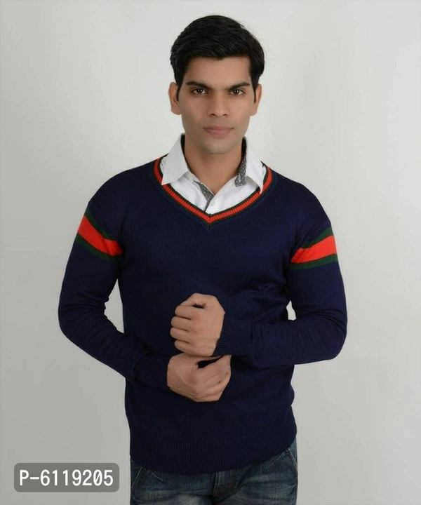 The Sweater is navy blue Solid Colour with V Neck . The Fabric is pure cotton , ideal for all seasons , makes you utter smart and handsome.