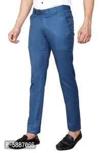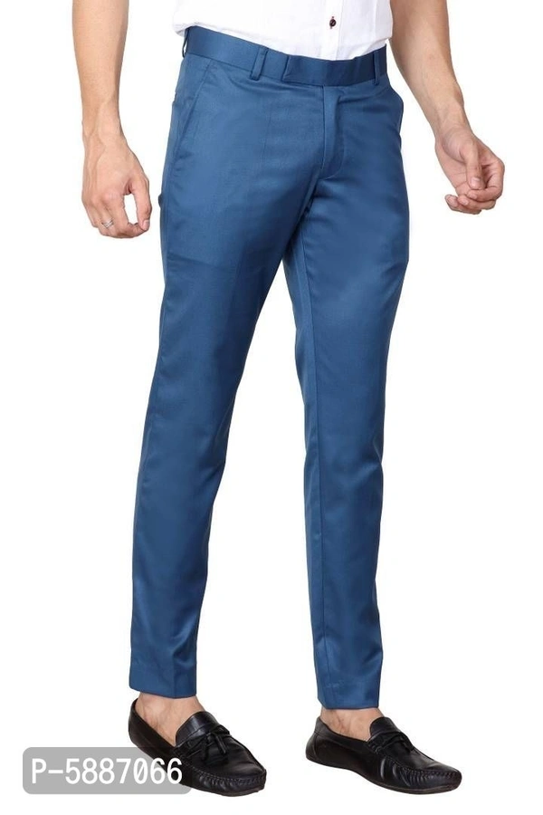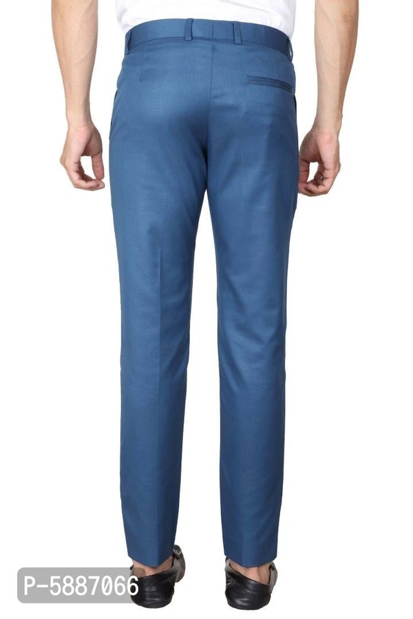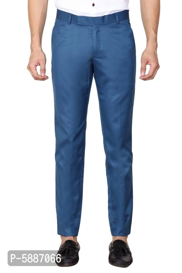 Solid Mid-Rise Stretchable Men's Formal Trousers-Blue, Button Closure With Zip Fly, And Three Pockets.
