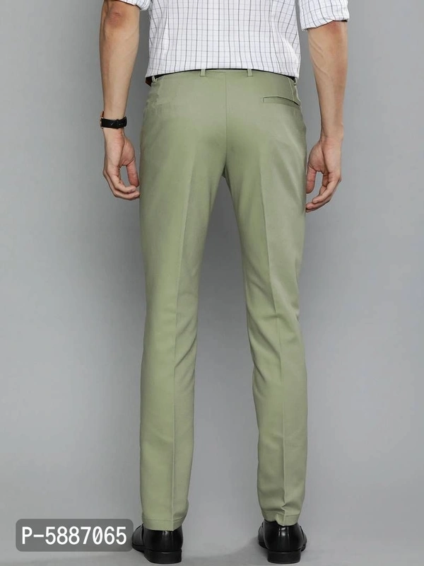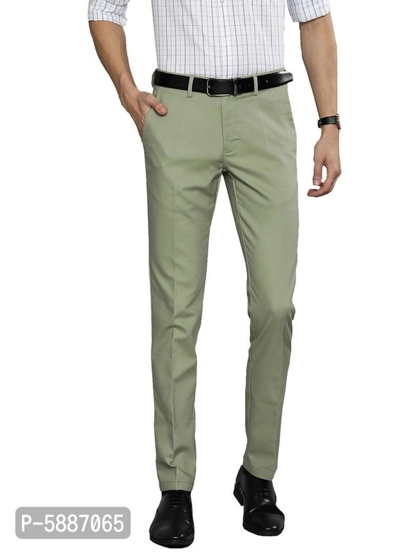 FABRIC: Cotton Blend || TYPE: Mid-Rise || STYLE: Solid || DESIGN TYPE: Other || FIT TYPE: Slim Fit || DELIVERY: Within 6-8 business days However, actual date depends on your pin code. || RETURN: Within 7 days of delivery. Free reverse pickup. Full refund. || Solid Mid-Rise Stretchable Men's Formal Trousers-Pista, Button Closure With Zip Fly, And Three Pockets.