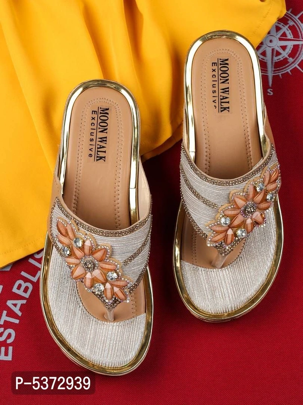 A Pair Of Nude-Coloured And Gold-Toned Open Toe Wedges, Has Regular Styling, Open Back Detail Synthetic Upper With Metallic And Cut-Out Detail Cushioned Foot bed Textured And Patterned Outsole, Has A Wedge Heel.