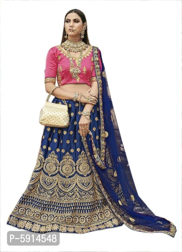 Women's Blue Semi-Stitched Embroidered Satin Silk Lehenga Choli